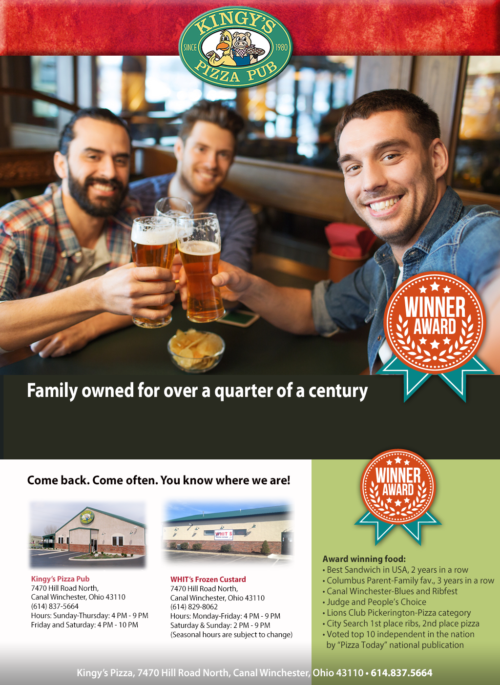 Proudly serving award winning food to bring together friends and families from all across Central Ohio and beyond for their family-friendly atmosphere and award-winning meals. For over 30 plus years, it is a home to many specialty dishes including pizza, ribs, sandwiches, subs and wings. The pizza pub patrons can enjoy live entertainment on the patio. Sports fans can watch the game around the fully stocked bar to cheer their team onto victory.