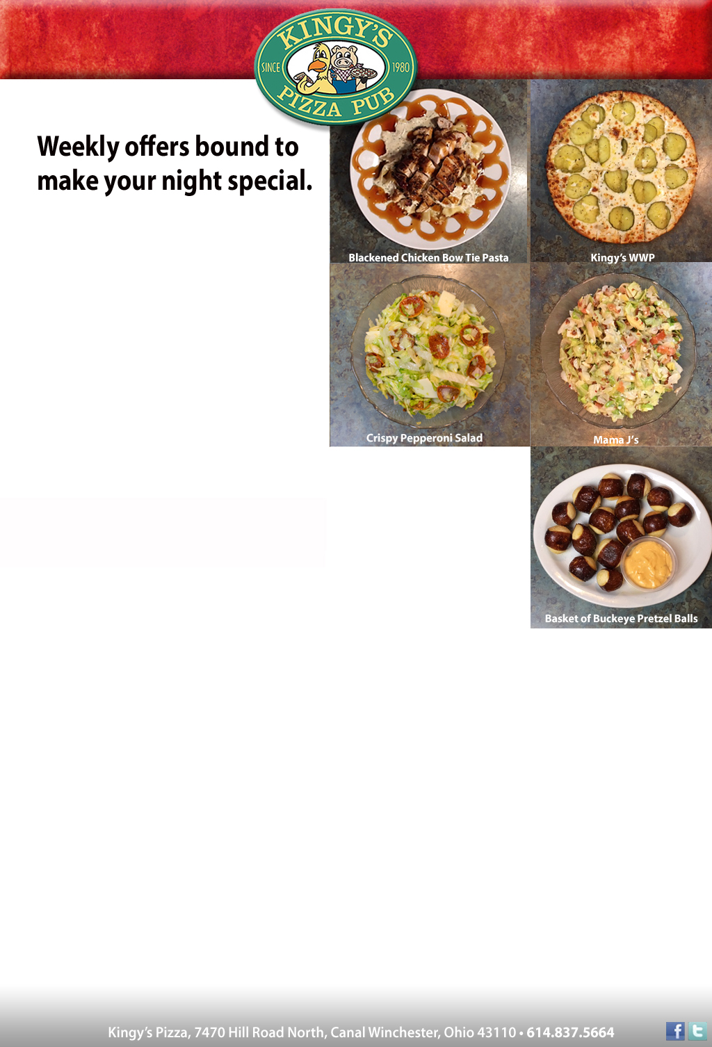 Kingy's WPP: Our White pizza topped with cheese and dill pickle slices. Sizes: 8"-$8.99, 10"-$13.99, 12"-$18.99, 14" $20.99